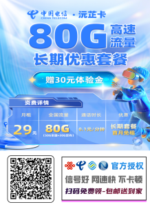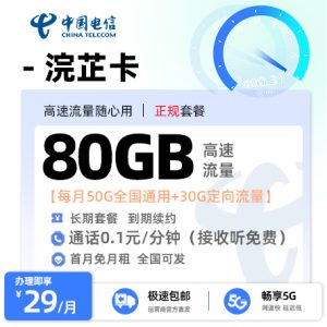 套餐资费:29元/月享50G通用流量+30G定向流量+0.1元/分钟通话(长期套餐,首月免租,高性价比)