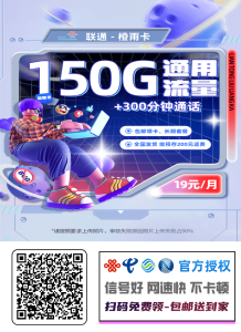 流量卡推荐:联通橙雨卡【限量发货】 19元/月享150G通用流量+300分钟通话