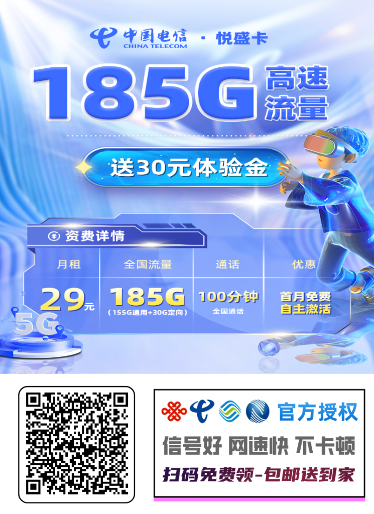 🚀【超值电信卡】🚀🎉电信悦盛卡 29元/月享155G通用流量+30G定向流量+100分钟通话