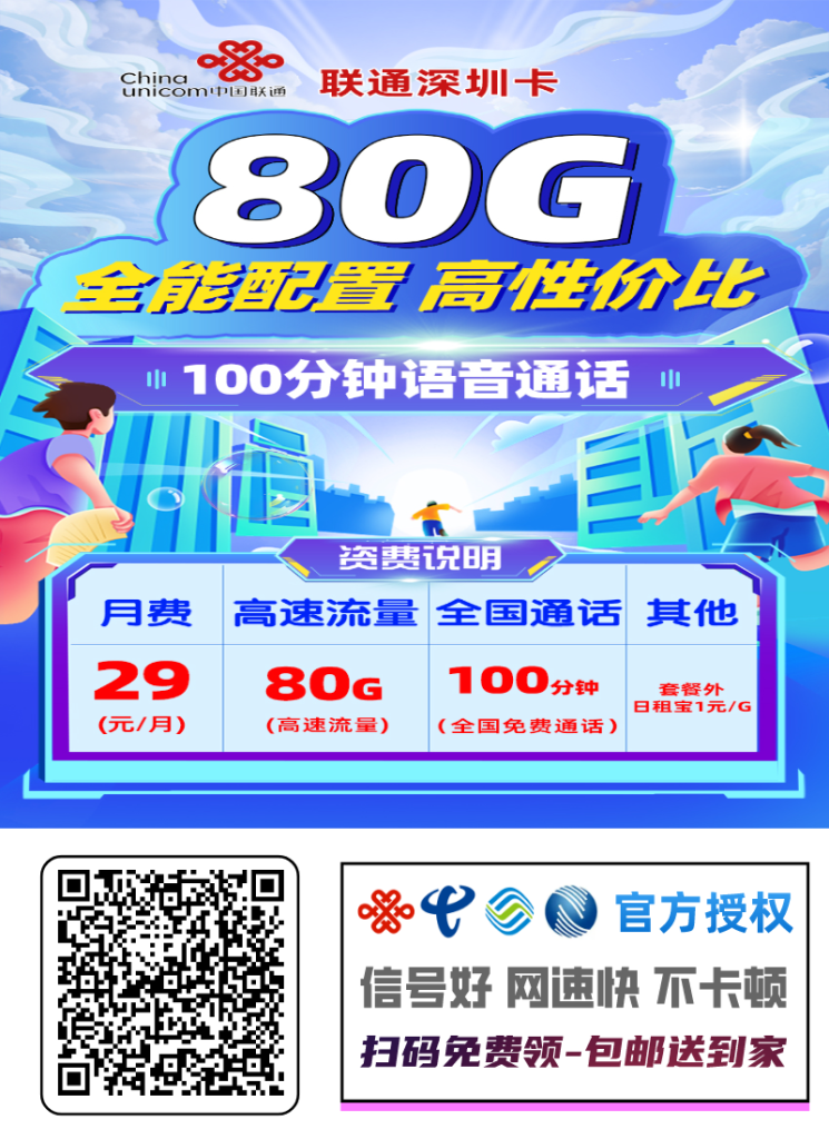 🚀联通深圳卡 29元/月享50G通用+30G定向+100分钟语音通话(在线选号)[仅发广东]