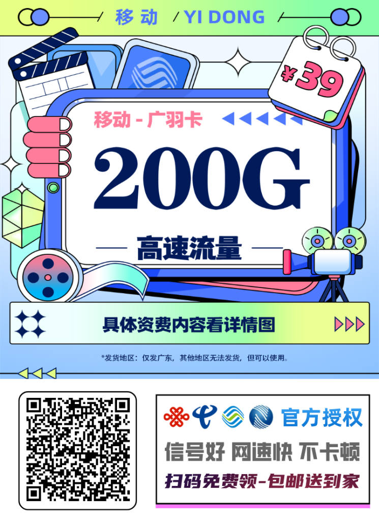 流量卡推荐:移动广羽卡【广东专属】39元/月享170G全国通用+30G定向流量+100分钟通话【仅发广州 深圳 佛山】