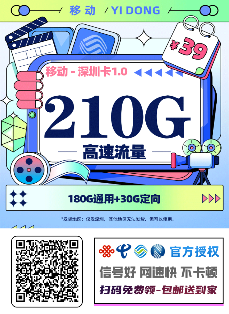 🚀移动深圳卡1.0【深圳专属】 39元/月享180G全国通用+30G定向流量+100分钟通话