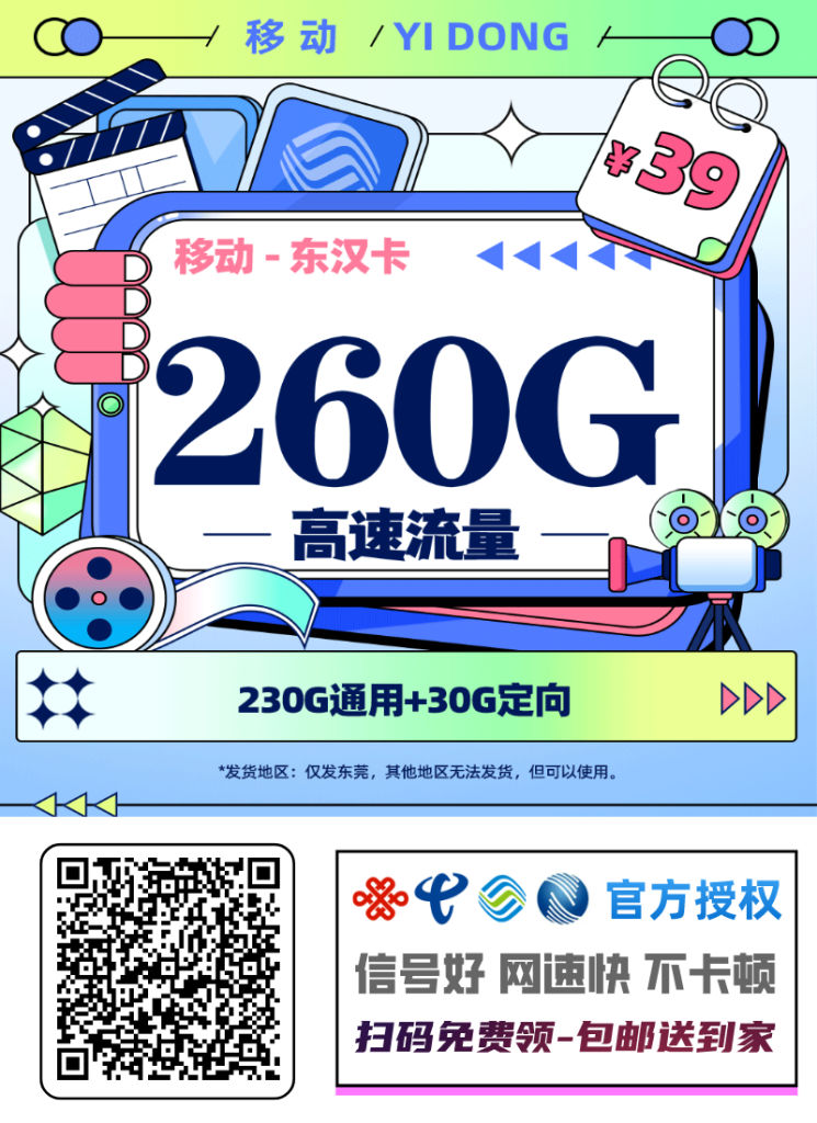 套餐资费:39元/月享230G全国通用+30G定向流量+100分钟通话(四年套餐,上门激活,仅发东莞)