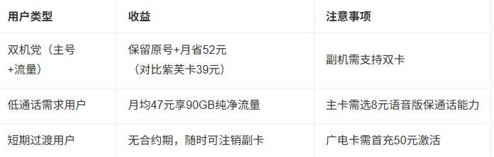 双机党(主号+流量) 保留原号+月省52元(对比紫芙卡39元) 副机需支持双卡