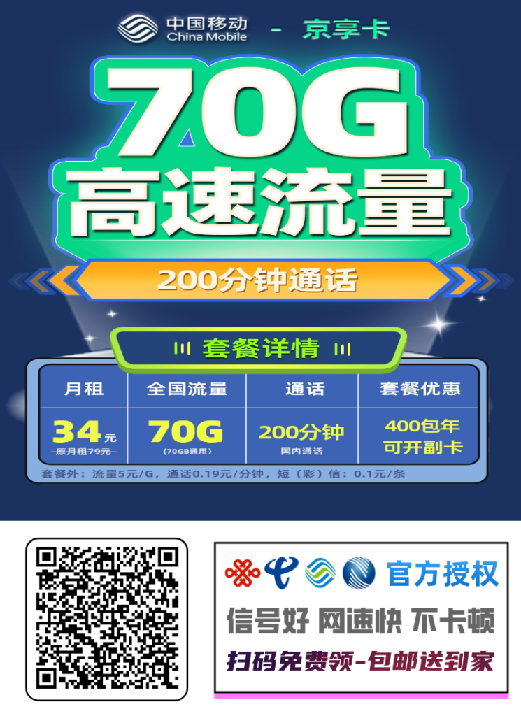 🚀移动京享卡【北京专属】 34元/月享70G全国通用+200分钟通话
