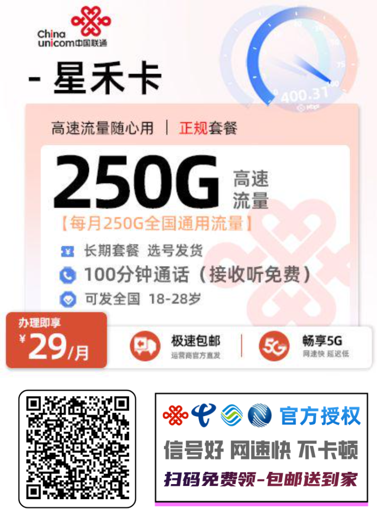 套餐资费:29元/月享250G通用+100分钟通话(高性价比,全能配置,全国发货,线上激活)